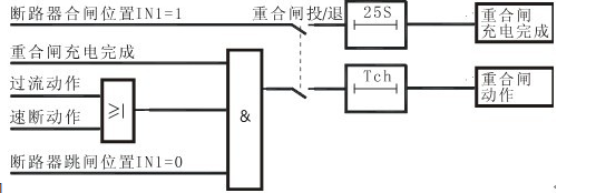 重合閘保護(hù)只有在速斷及過電流保護(hù)動作跳閘后才啟動。重合閘必須在充電完成后才能動作。此時(shí)若發(fā)生故障跳閘,重合閘自動啟動并放電,當(dāng)重合于故障時(shí),后加速(可投退)跳閘,不再重合。重合閘的充放電過程由軟件模擬實(shí)現(xiàn)。